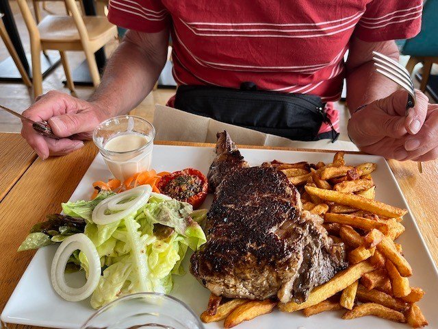 We just got back from the restaurant and feel so good after a decent sized meal. Mike had a 300 gram steak and I had 3 large lamb chops with chips and salad. It was a huge meal and we ate it all.
