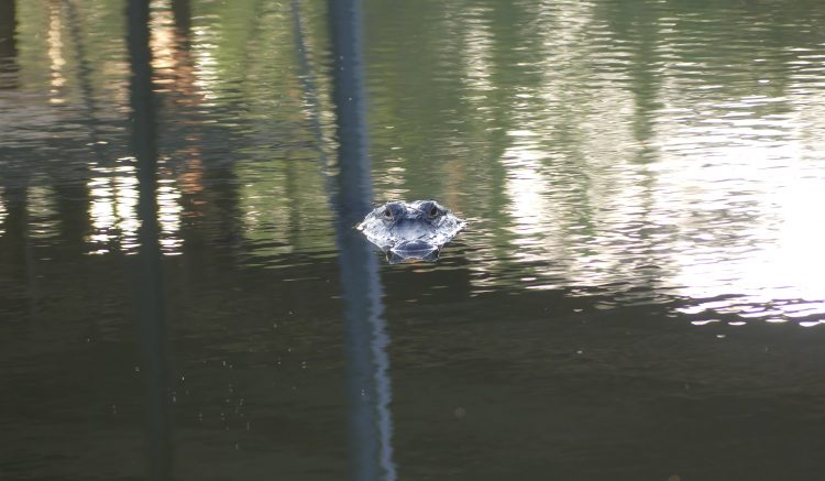 I got some good photos of this one, which was lurking near the free campground there, apparently hoping to be fed. He started swimming towards us. I think he was attracted to the fuzzy microphone on the GoPro, so I asked Mike to put it in the bag. As soon as he did this, the alligator started swimming away. It’s pretty cool to be able to see them though, in the wild. No need to pay to go to an alligator farm now!