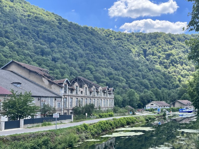 We stopped at a town called Besançon for lunch. We were going to look around the town but both felt really claustrophobic. It didn’t help that we had to push our bikes through road works with jack hammers hammering away. But we found a small shop and grabbed a couple of salads and ate them by the river.